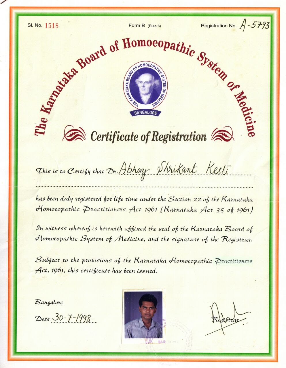This certificate, issued by the Karnataka Board of Homeopathic System of Medicine, certifies that Dr. Abhay Shrikant Kesti has been duly registered for a lifetime under the Karnataka Homeopathic Practitioners Act of 1961. Dated July 30, 1998, this registration acknowledges Dr. Kesti’s qualifications and authority to practice homeopathic medicine. This certification not only solidifies his expertise in homeopathy but also enhances his ability to conduct therapeutic yoga classes with a comprehensive and scientific approach. The integration of medical knowledge with Iyengar Yoga enables a deeper perspective in both learning and teaching, ensuring a holistic approach to health and well-being.