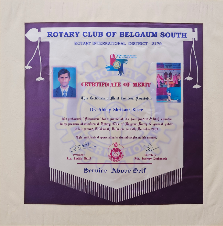 “I have demonstrated exceptional discipline and mastery by performing Shirshasana (Headstand) for 90 minutes on one occasion and 110 minutes on another. One of these remarkable performances took place during the Little Champs singing event, where I held Shirshasana for the entire duration in front of thousands of spectators. In recognition of this extraordinary feat, I was awarded this Certificate of Merit by the Rotary Club of Belgaum South. Notably, the current world record for Shirshasana stands at just 33 minutes, making my achievement a testament to the power of dedication, focus, and the Iyengar Yoga method.”
